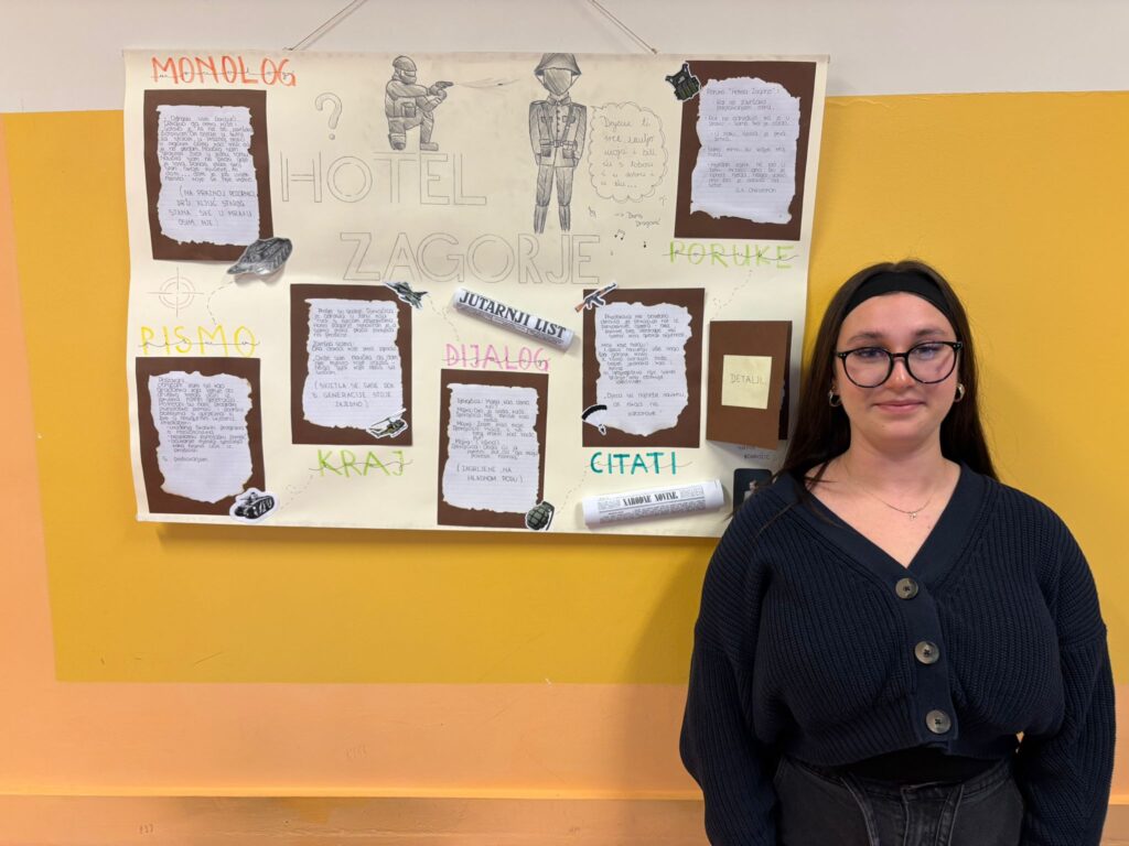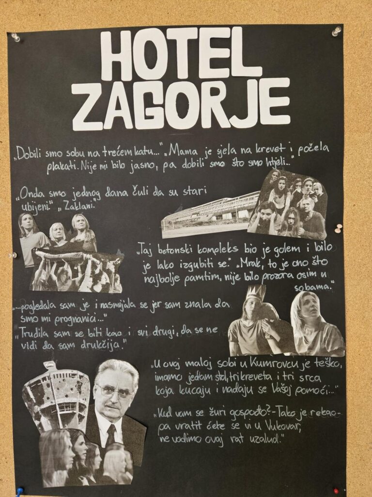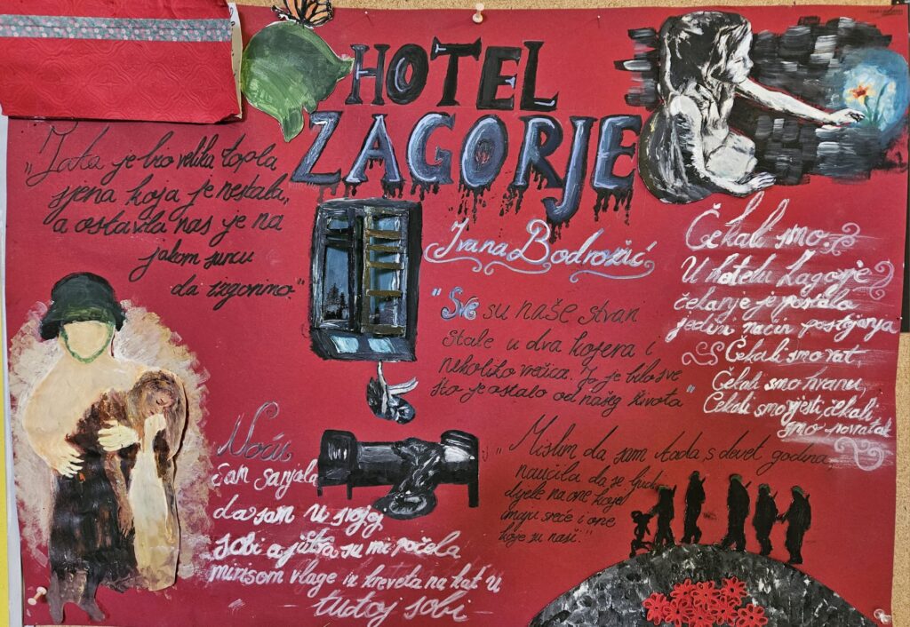 Dana 16. ožujka 2026.održana je završna manifestacija projekta Večeri u kazalištu 2026. Nakon što smo gledali predstavu Hotel Zagorje – autorski projekt Anice Tomić i Jelene Kovačić prema motivima romana Ivane Bodrožić, učenici su pristupili izradi projektnih zadataka i pokušali su svojim radovima odgovoriti na pitanja kako otvoriti nacionalnu traumu iz Domovinskog rata trideset godina kasnije.